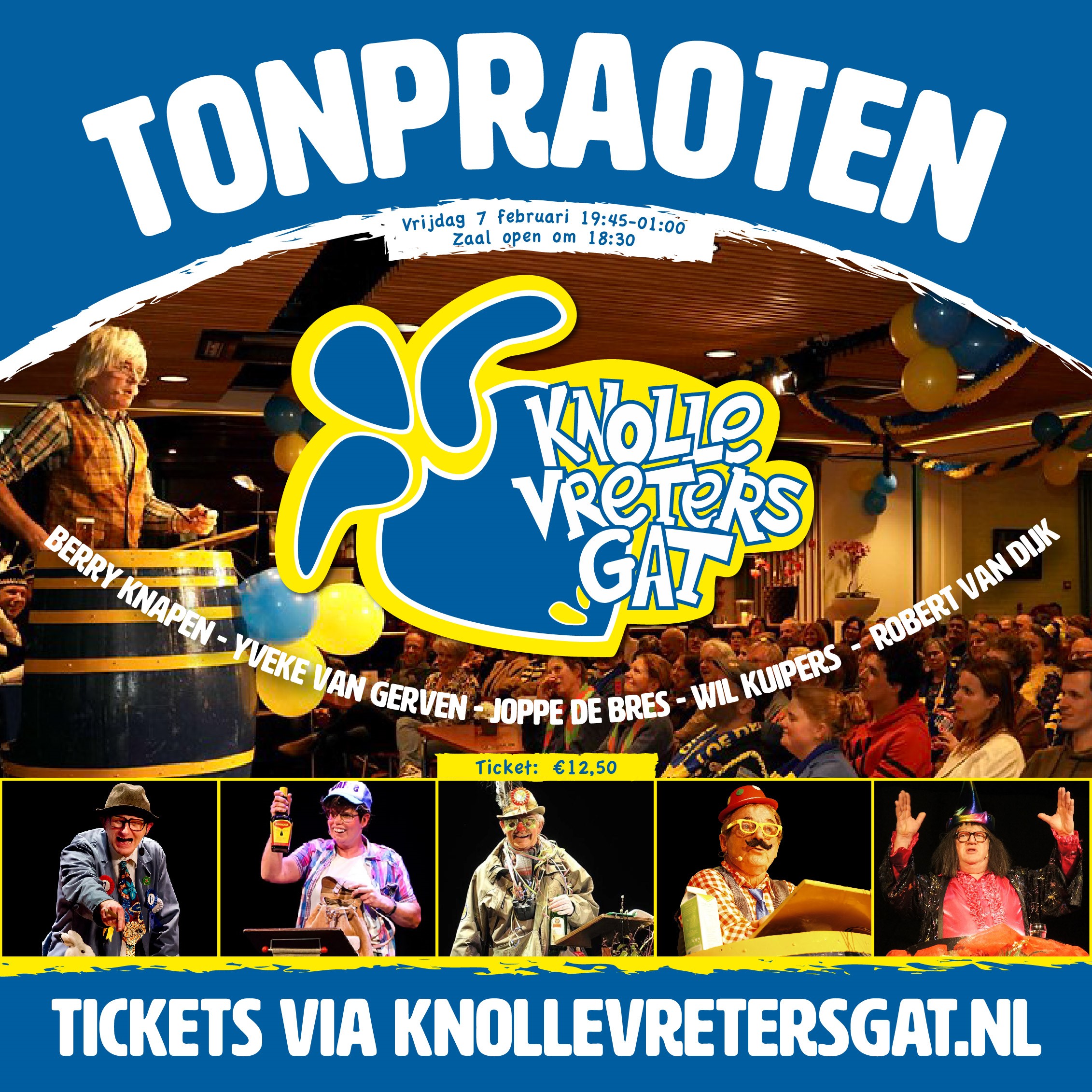 De kaartverkoop voor het Tonpraoten op vrijdag 7 februari is gestart. Ga naar de webshop en kies meteen je zitplaats. Het Tonpraoten is dit jaar ook in de feesttent op het Wilhelminaplantsoen.